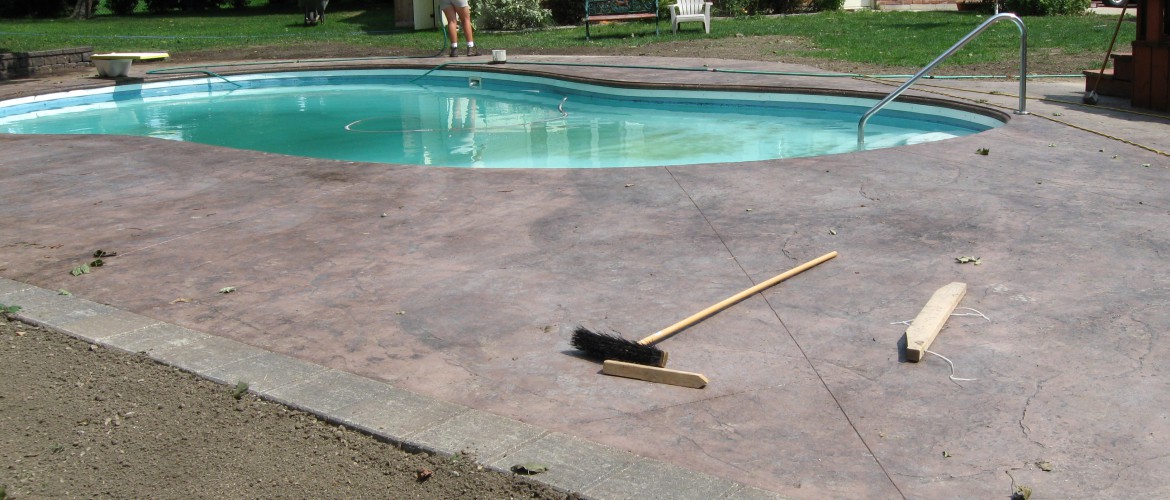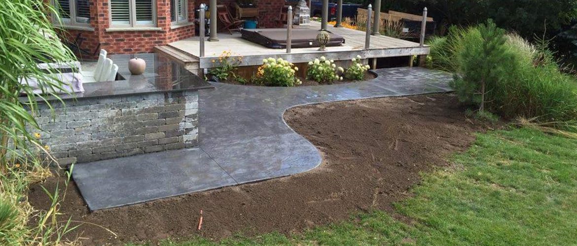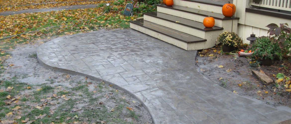 This was a total concrete transformation of an old property done with over 2000 Sq ft of decorative concrete in the back yard to a brushed white drive an walkway in the from. We also designed the front porch an built it to code.